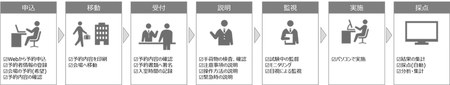 試験事務局代行、申込受付、サポートデスク、受験料徴収、会場予約、テストセンター会場、自宅会場の事前環境チェック、試験当日受付、本人認証、試験実施、試験監視、結果採点、MYページ登録、試験結果報告及び解析までの全ての試験運営をオールインワンで受託します。